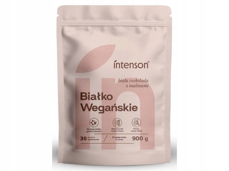 Intenson Białko roślinne to połączenie białka grochu (90%) z dodatkiem białka konopnego (2,8%) oraz naturalnych aromatów białej czekolady i malin.