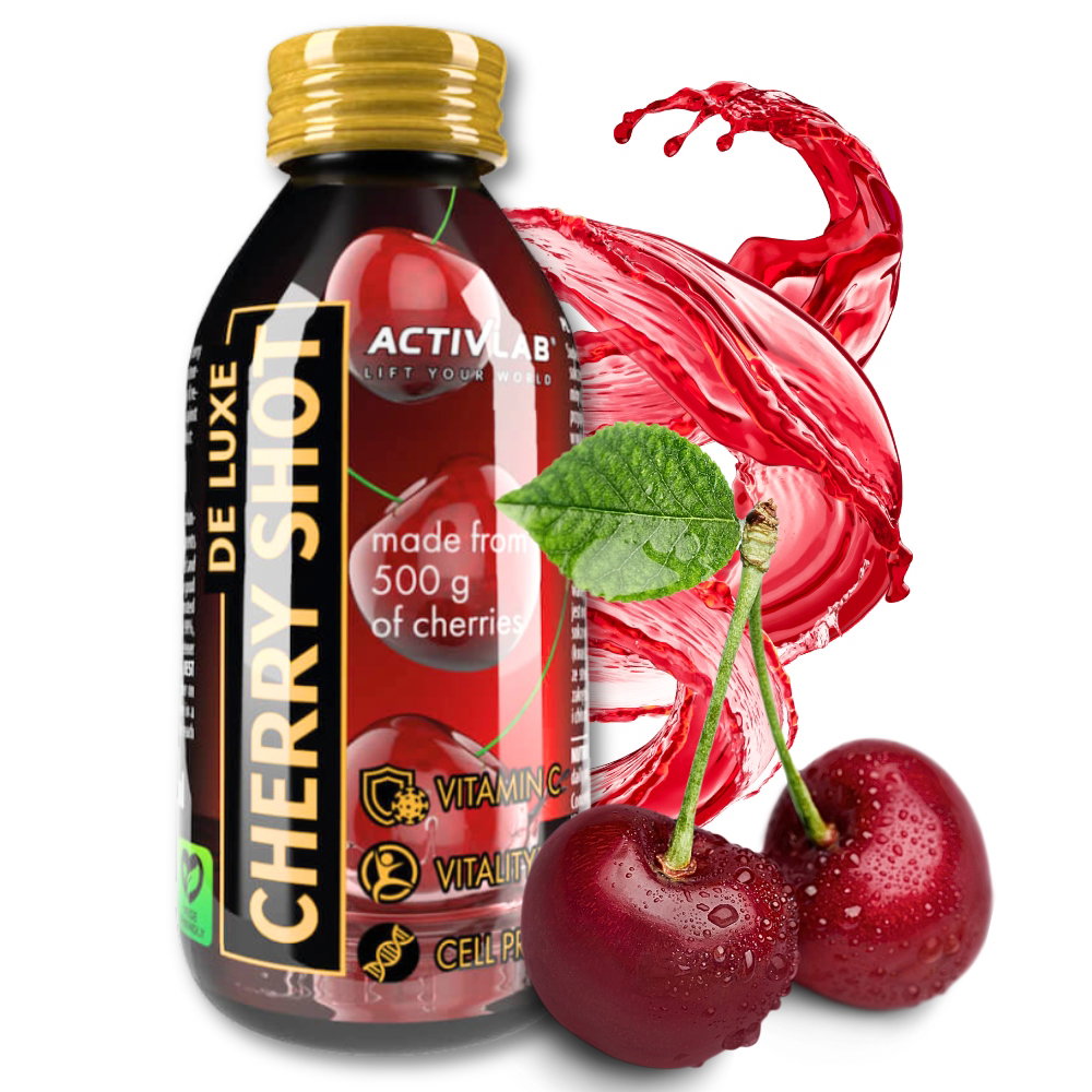 De Luxe Cherry Shot to suplement diety w formie shota, który zawiera zagęszczony sok z gorzkiej wiśni (99%) oraz witaminę C.