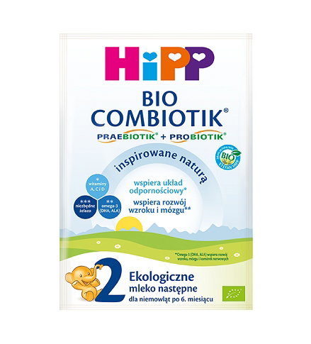 Mleko następne HiPP 2 BIO COMBIOTIK® jest dopasowane do potrzeb żywieniowych niemowląt po 6. miesiącu życia, które z różnych powodów nie mogą być karmione piersią. Mleko jest odpowiednie po zakończeniu karmienia piersią lub każdym mlekiem początkowym. Zgodnie z przepisami prawa regulującymi skład mleka dla niemowląt, zawiera witaminy A, C i D, żelazo oraz kwas dokozaheksaenowy (DHA) i kwas alfa-linolenowy (ALA).