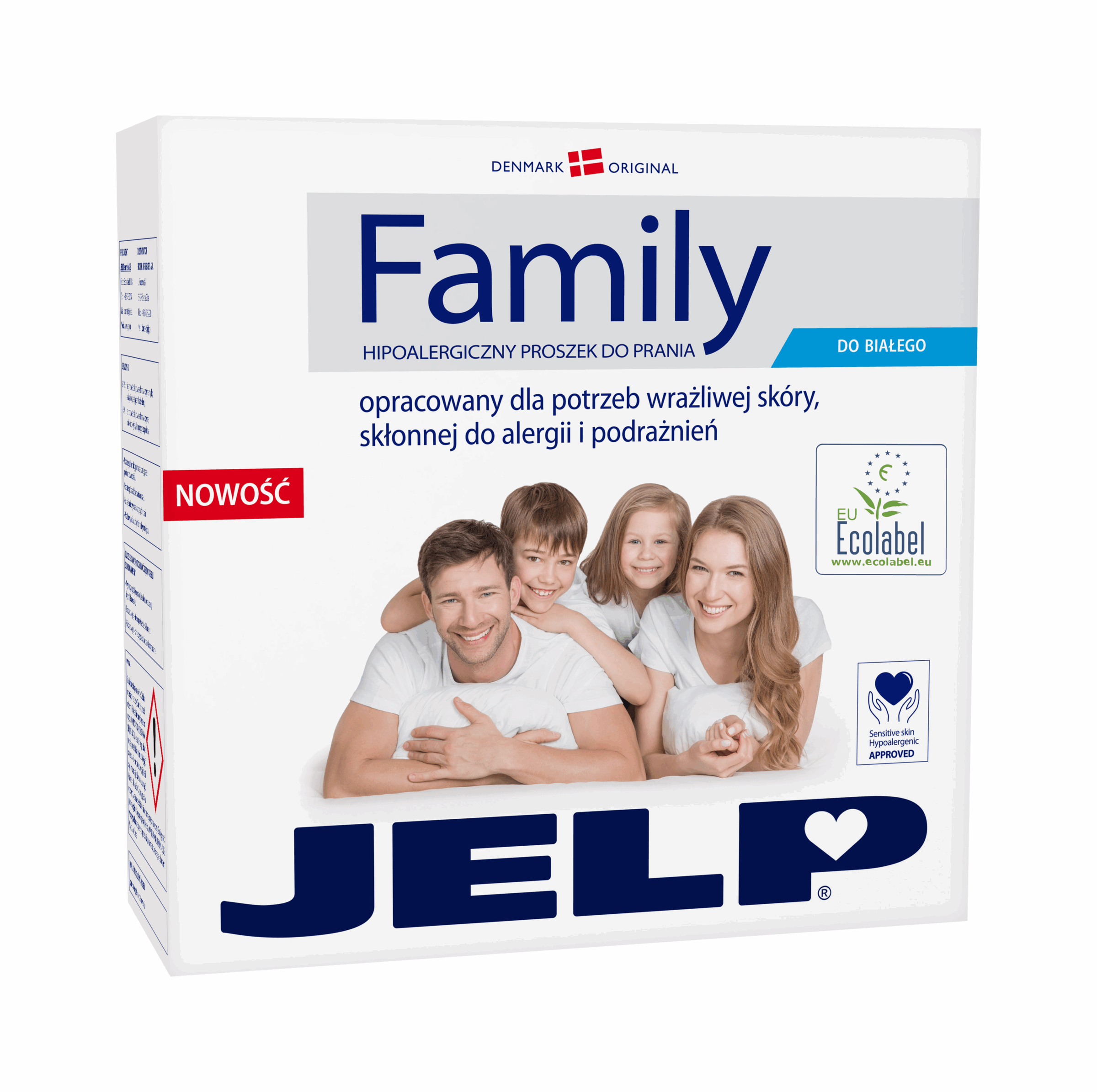 Jelp Family to proszek do prania bieli, przeznaczony dla całej rodziny. Dzięki recepturze wolnej od alergenów, proszek nie powoduje podrażnień i jest delikatny dla skóry – zarówno dzieci jak i dorosłych. Doskonale usuwa zabrudzenia i chroni białe tkaniny przed szarzeniem.